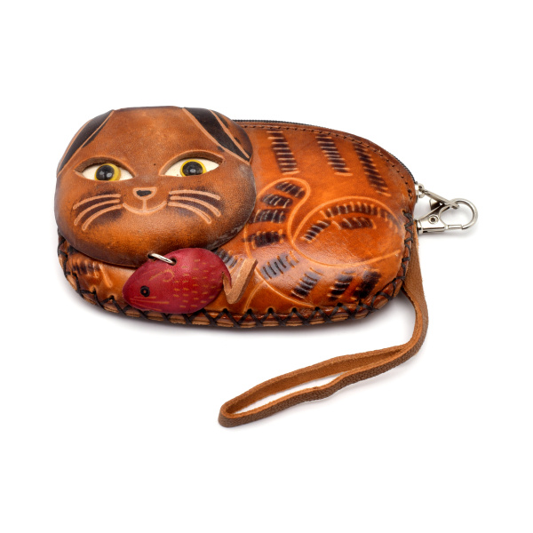 Кошелек в виде кота с мышкой. Кожа. Размер 13,5×9 см