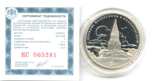 3 рубля — Памятник всемирного культурного наследия ЮНЕСКО Церковь Вознесения в Коломенском 2012 СПМД. В капсуле, с сертификатом (Россия)
