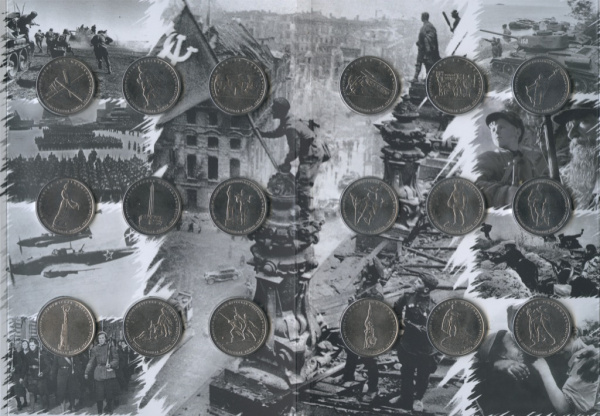 Лот монет 5 рублей — 70-летие Победы в Великой Отечественной войне 1941−1945 гг. Ключевые сражения 2014 ММД. Альбом. 18 шт (Россия)