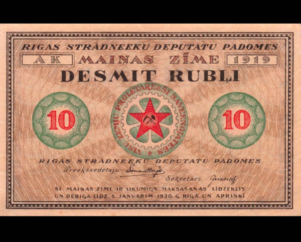 10 рублей (Pick: # r4) 1919. Латвия, Рига, Совет рабочих депутатов (Россия: Гражданская война)