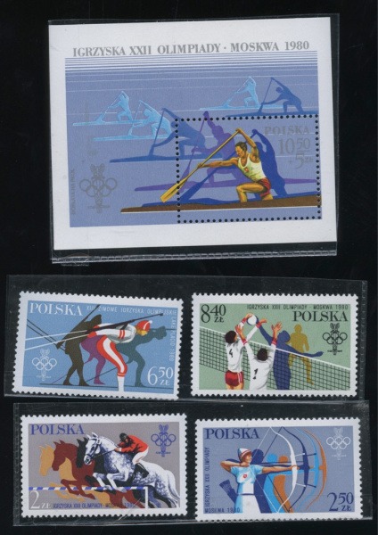Лот почтовых марок и блок «Олимпийские игры, Москва 1980». 5 шт (Польша)