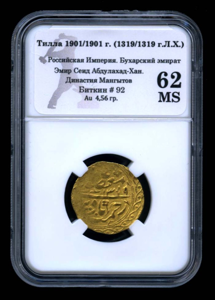 Тилла. Бухарский эмират. Эмир Сеид Абдулахад -Хан. Династия Мангытов 1901. В оригинальном сертифицированном слабе® MS 62 (Российская Империя)