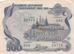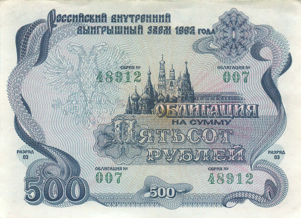 Банкнота специального выпуска: 500 рублей 1992 года «Облигация. Синий». Российский внутренний выигрышный заем 1992 г. Российская Федерация: Банк России (1992 — 1996).