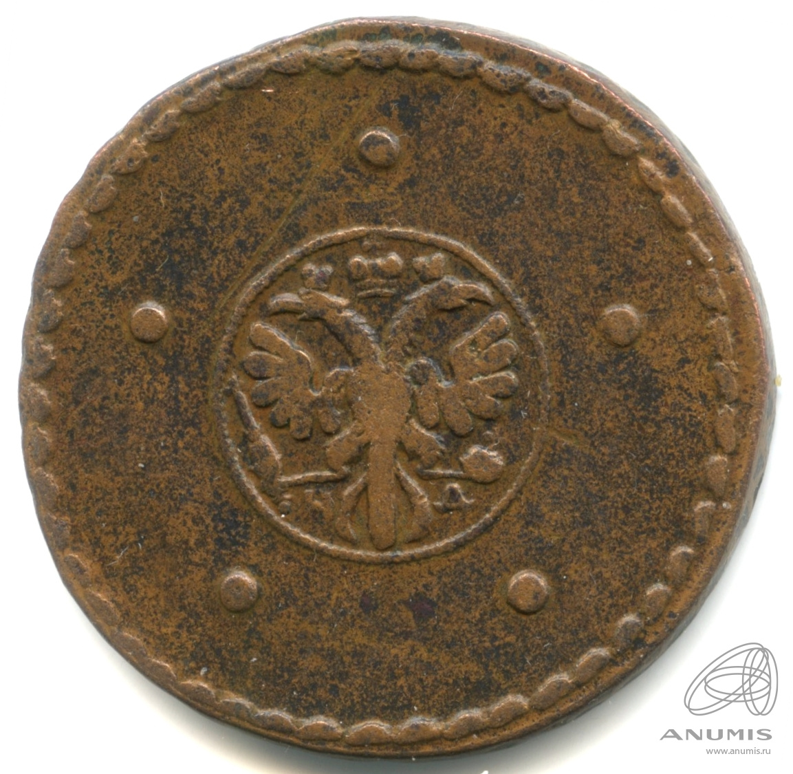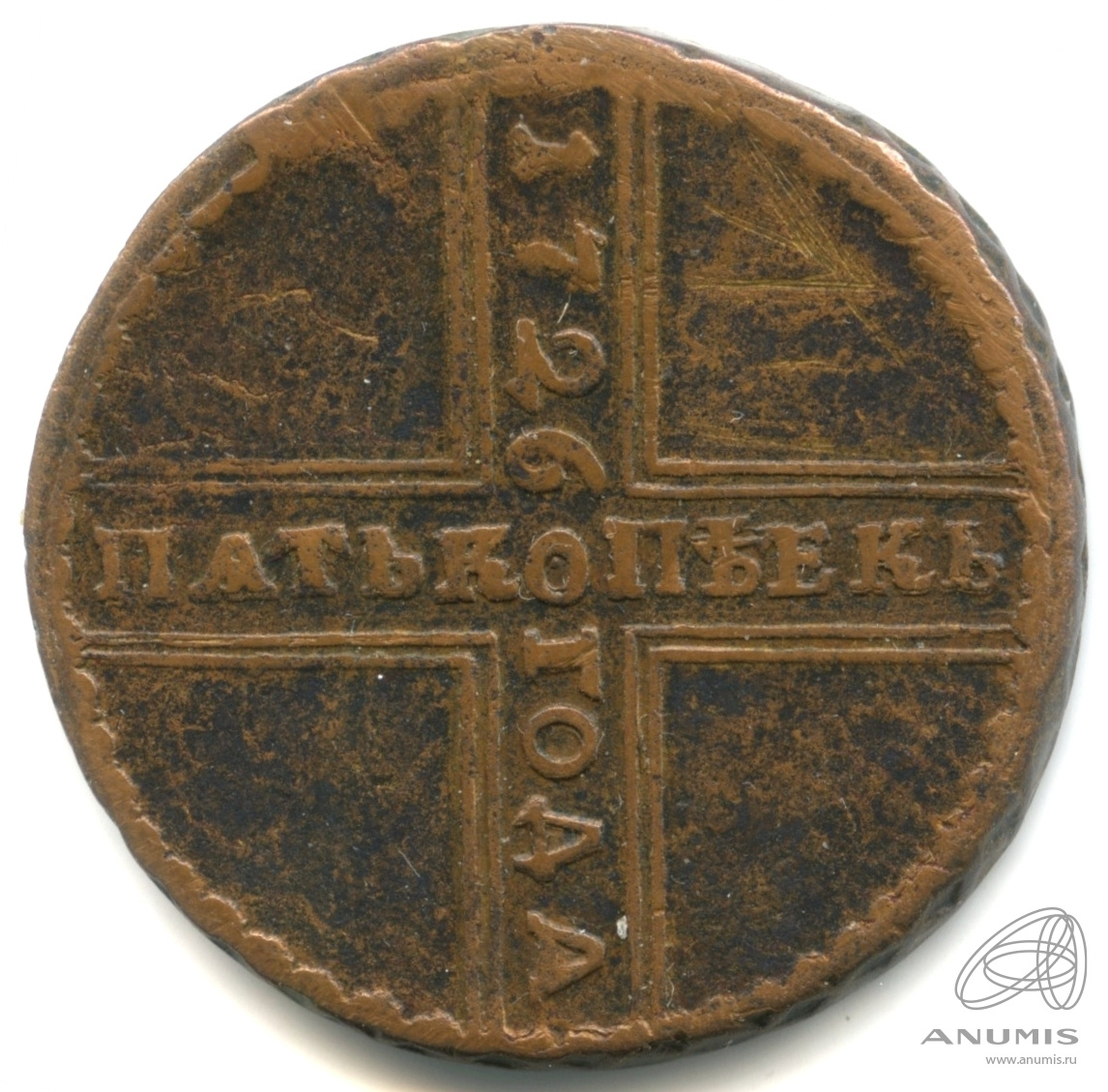 Монета регулярного выпуска: 5 копеек 1726 года «Крестовые 5 копеек». 5 копеек 1723 — 1730 гг. Российская Империя: Екатерина I (1725 — 1727). Монетный двор: Кадашевский монетный двор, г. Москва. Медь, 20 г, ø 31−33 мм, Гурт: Узор.