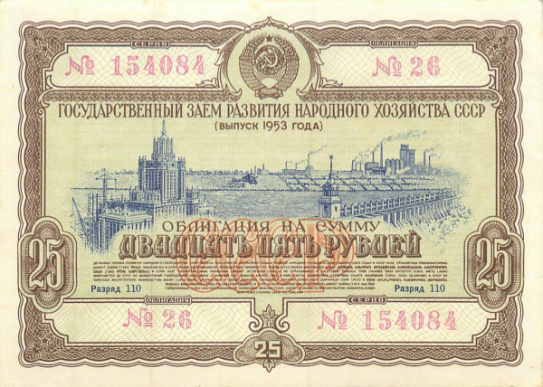 Банкнота специального выпуска: 25 рублей 1953 года «Облигация. ¼ часть». Государственный заем развития народного хозяйства СССР 1953 г. Союз Советских Социалистических Республик: СССР ранний (1924 — 1958).
