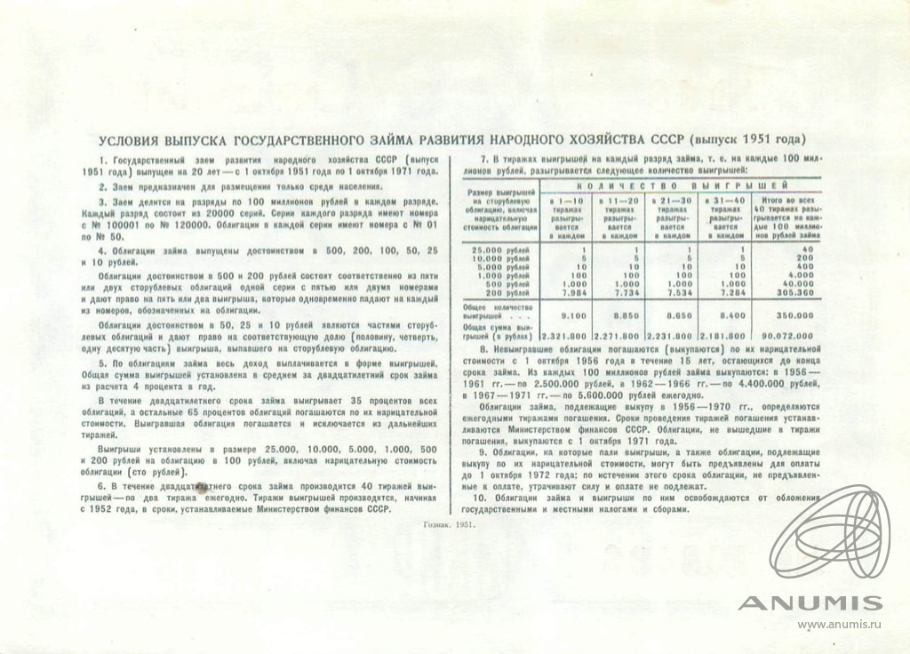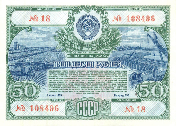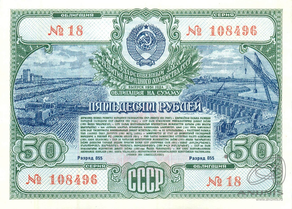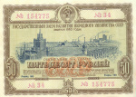 Банкнота специального выпуска: 50 рублей 1951 года «Облигация. ½ часть». Государственный заем развития народного хозяйства СССР 1951 г. Союз Советских Социалистических Республик: СССР ранний (1924 — 1958).
